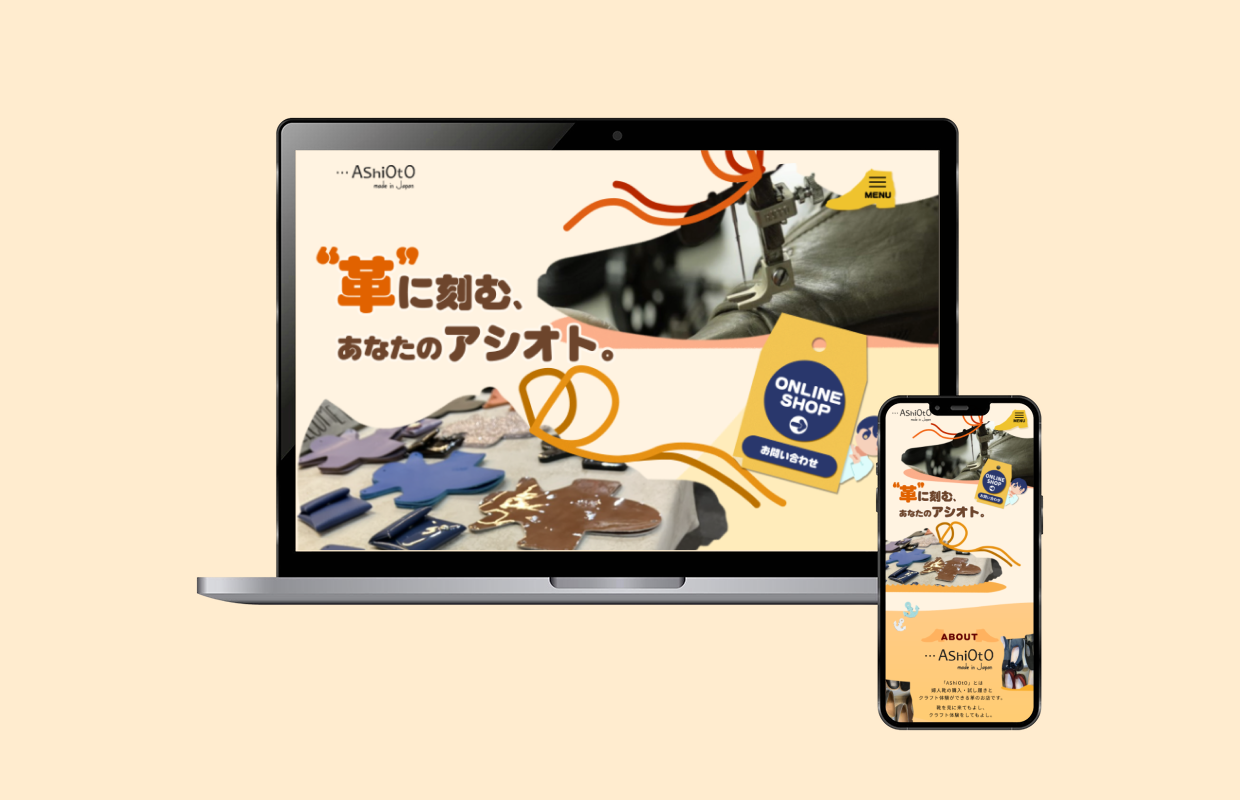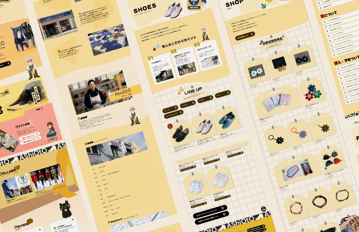 靴の製造・販売とクラフト体験を行うブランド「AShiOtO」のWebサイトを制作しました。本制作は初めてのクライアントワークであり、使用する素材の撮影からデザイン、サイト構築まで一貫して一人で制作しています。 本サイトでは、靴の魅力だけでなくクラフト体験の存在も自然に認知してもらうことを重視しました。 特にトップページでは、靴のセクション下にクラフト体験の要素を“チラ見せ”することで、「体験もできるブランドである」という気づきを促す設計にしています。 また、革素材が持つ高級感に対し、あえて親しみやすさやポップさを取り入れることで、ユーザーが気軽に興味を持てるような世界観を目指しました。
