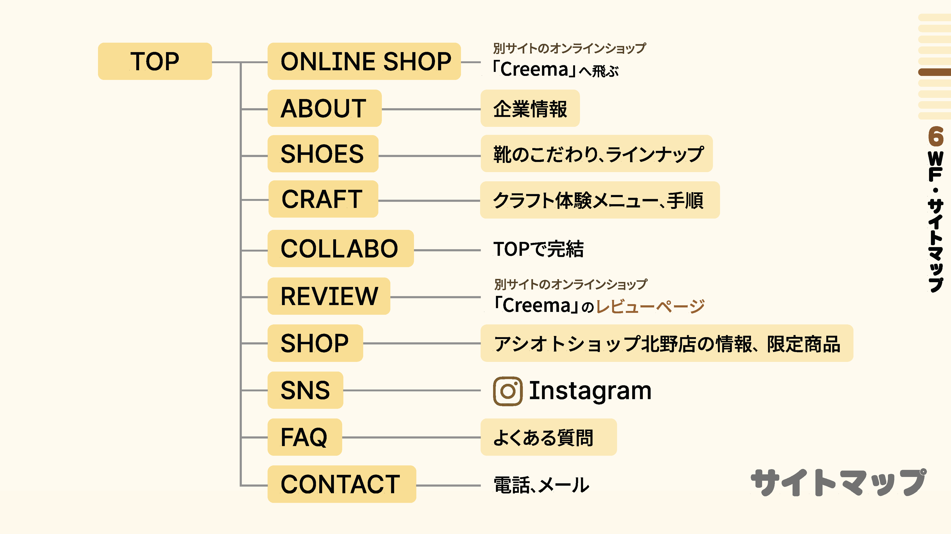 下層ページの「CRAFT」や「SHOES」などのページでは欲しい商品・体験メニューの商品など 分けて閲覧することができます。
