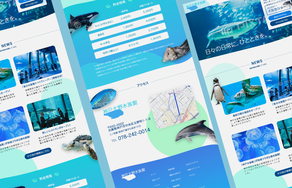 まず拘ったのは、水族館の温かい雰囲気を出すことを心がけました。例えば、newsの写真を角丸にしたり料金情報の背景を水っぽく演出しています。そして、所々に動物の切り抜き写真を入れることでユニークさや元気な感じが伝わるようにしました。さらに、サイトを開いた瞬間に見えるメインビジュアルには、本日のメインイベントの紹介やチケットへの動線などサイト利用者が便利と感じるような構成にしました。